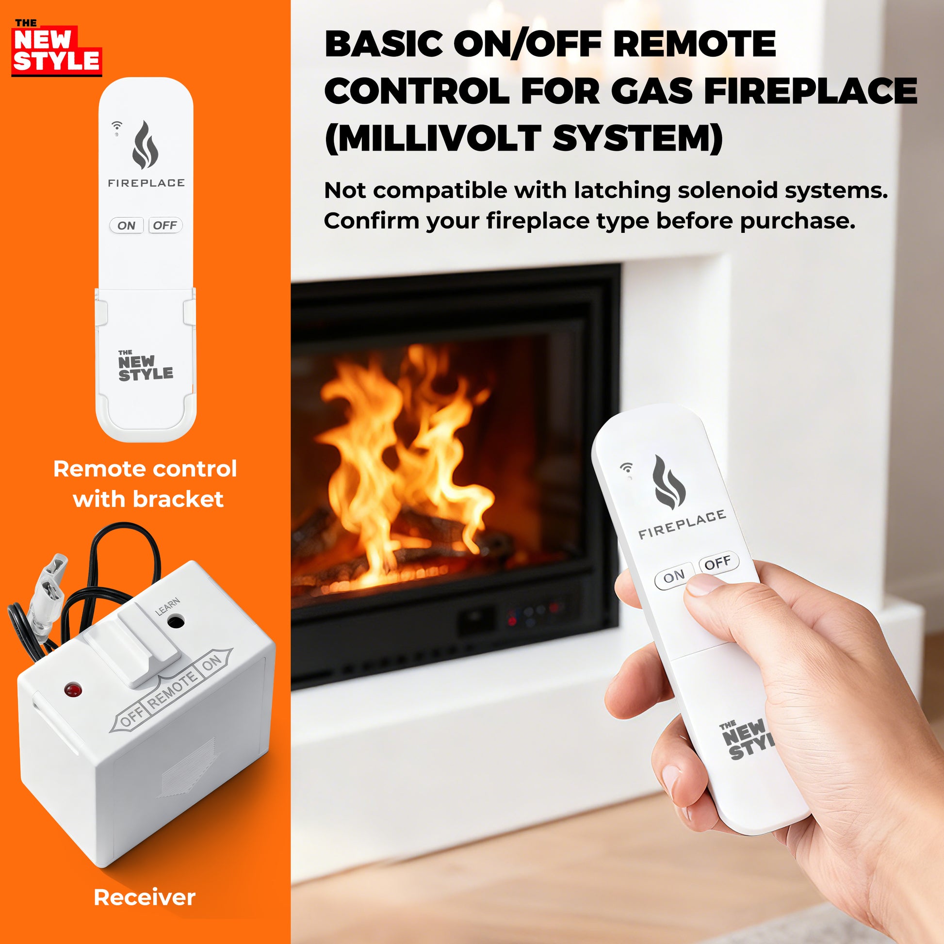 • Upgraded fireplace basic remote on/off control system ,Remote allows you to turn your gas logs on/off , Receiver connects to any standard millivolt gas valve system , replace skytech ,ambient, majestic, monessen,vermont castings,acumen,napoleon,rasmussen,superior,grand canyon,iFlame,real fyre,hargrove And more brands of millivolt gas valve fireplaces